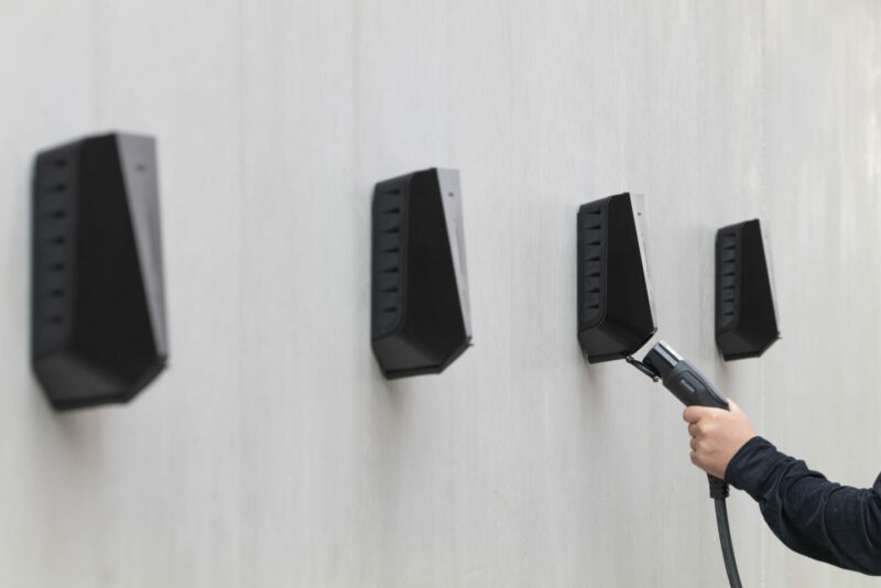 Black Easee chargers mounted on concrete wall.
